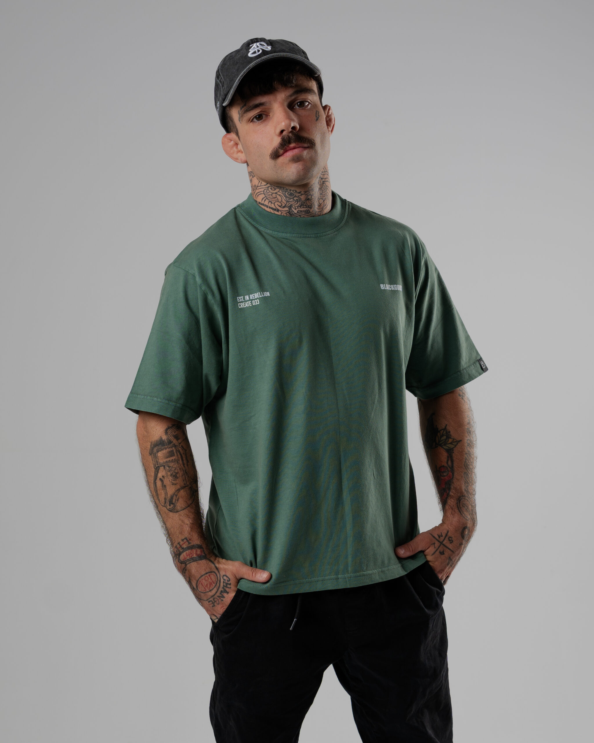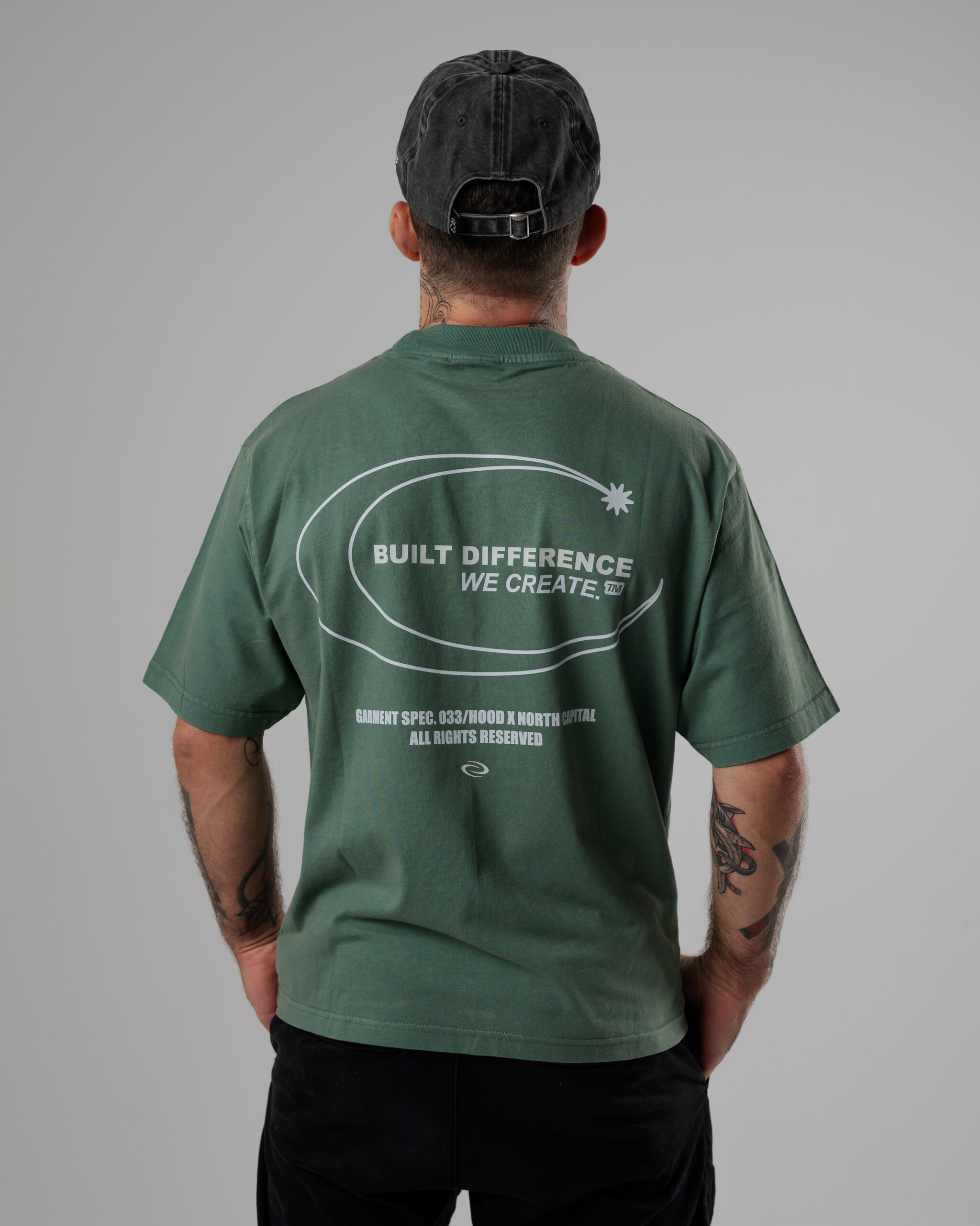 Colores: azul oscuro interior de tejido principal en el cuello y hombros caídos. logo frontal y estampado trasero en blanco, verde oliva interior de tejido principal en el cuello y hombros caídos. logo frontal y estampado trasero en blanco