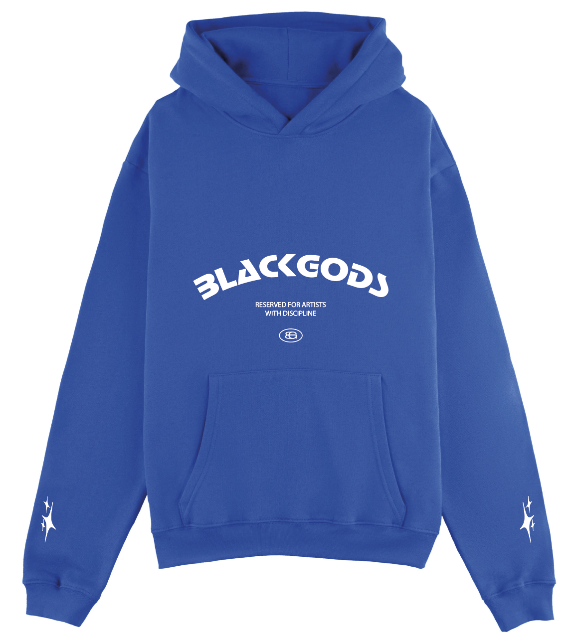 Colores: azul interior de tejido principal en el cuello y hombros caídos. logo frontal en blanco.