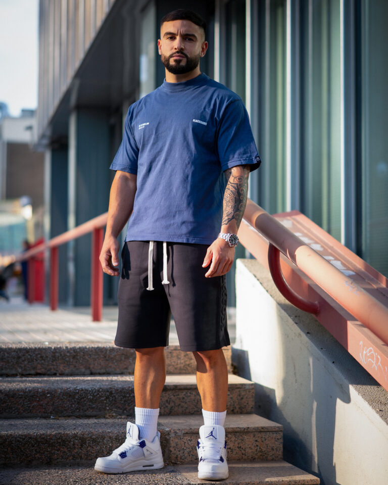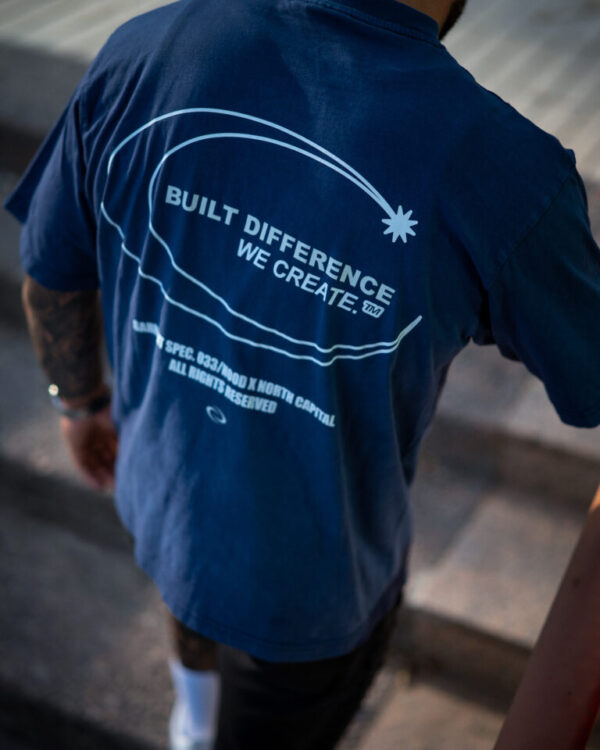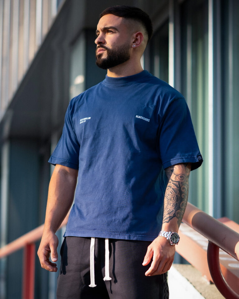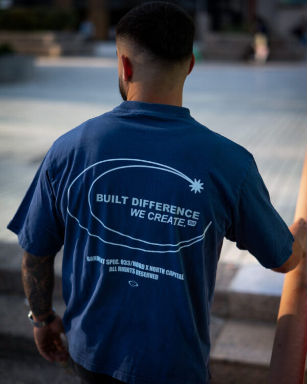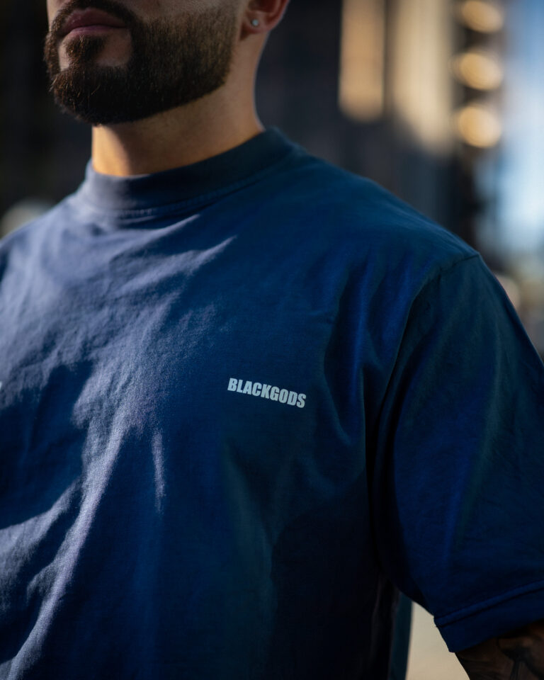 Colores: azul oscuro interior de tejido principal en el cuello y hombros caídos. logo frontal y estampado trasero en blanco, verde oliva interior de tejido principal en el cuello y hombros caídos. logo frontal y estampado trasero en blanco